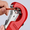 Tagliatubi Knipex "Tubix" Quicklock - Codice 90 31 02 BK.Consente un'applicazione rapida e precisa della rotella di taglio su tubi di diverso diametro.Fissaggio rapido con una sola mano QuickLock: tenuta e serraggio indipendente sul tubo.Facile taglio tramite cuscinetto ad aghi di alta qualità sulla rotella di taglio e sui rulli guida.CaratteristicheTaglia tubi con Ø 6 - 35 mm (1/4" - 1 3/8") e spessore della parete fino a 2 mm.Rotella di taglio in acciaio per cuscinetti a sfere di alta qualità.Pratico sistema di cambio rapido della rotella di taglio - con rotella di ricambio nel pomello della maniglia.Con sbavatore rettificato di precisione, facile da rimuovere.Per elettricisti professionisti: adatto anche per il taglio di tubi corrugati in acciaio.Alloggiamento in metallo magnesio leggero e resistente.