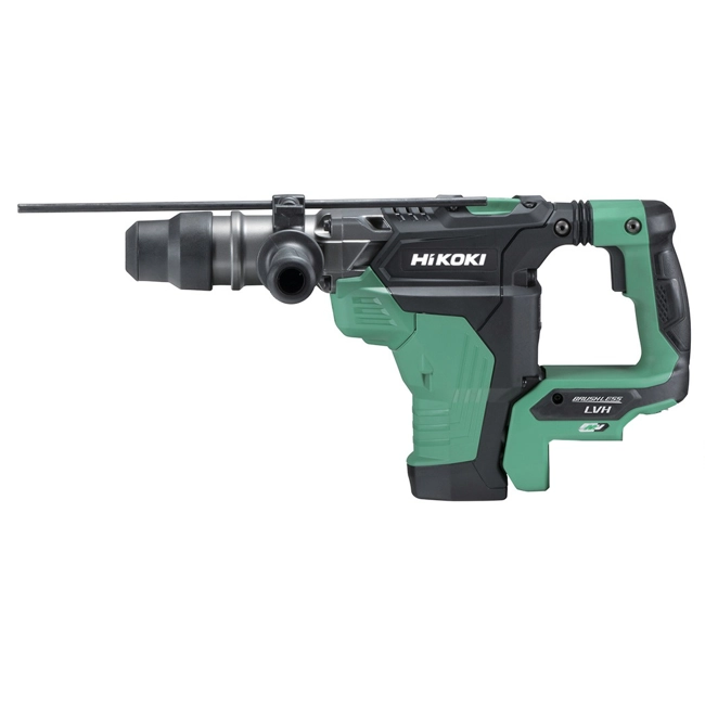 Martello tassellatore da 36V - 7,1 Joule - Codice HiKOKI DH36DMAW2Z - SOLO CORPO MACCHINA. Modello super-innovativo della serie MULTI VOLT. Caratteristiche Tecnologia Brushless. Super innovativo e performante essendo dotato dell'esclusiva tecnologia Brushless di Hitachi che consente prestazioni e versatilità di lavoro eccezionali unite ad un elevato prolungamento della vita di servizio della macchina dovuto all'assenza delle spazzole ed alla gestione completamente elettronica di tutte le sue funzioni. Assenza completa di attrito e scintille, interruttore sottoposto solo a correnti pilota non elevate = rendimento + 50%! rispetto ad un motore tradizionale! Speciale funzione RFC (Reactive Force Control) che consente di evitare lesioni al braccio dell'operatore in caso di bloccaggio della punta, grazie ad un sofisticato sensore interno che controlla continuamente la forza del motore e l'eventuale improvviso bloccaggio, intervenendo tempestivamente prima che il braccio dell'operatore si pieghi pericolosamente. Dotato di sistema atto alla riduzione delle vibrazioni LVH (Low Vibration Handle). Le vibrazioni vengono assorbite dalla speciale impugnatura ammortizzata. Attacco SDS-MAX.Funzione di rotazione con percussione. Frizione di sicurezza. Verso di rotazione reversibile. Velocità variabile.