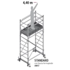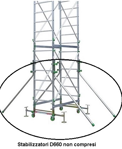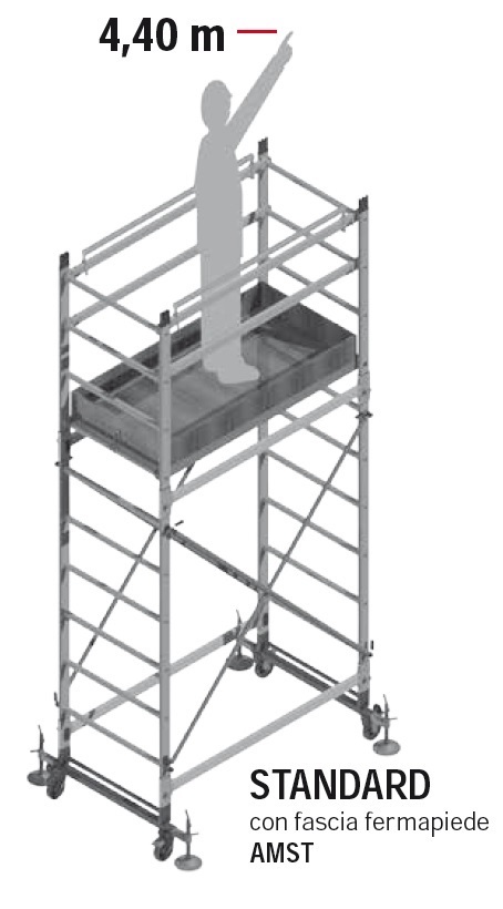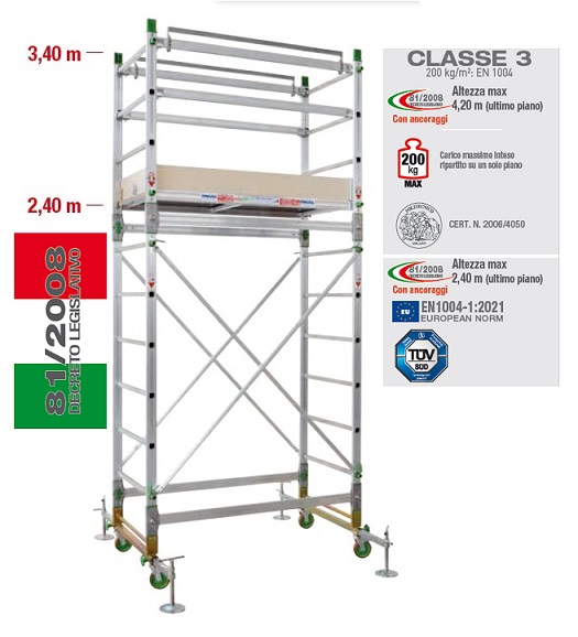 TRABATTELLO PROFESSIONALE - Codice Facal AMST. Rispondente al Decreto Legislativo 81/2008. Facal dichiara che Eurotrabatello Alumito e Alumito Maxi sono costruiti in conformità al D.LGS 81/2008 con obbligo di ancoraggi.I collaudi resi obbligatori dal decreto 27.3.98 sono stati eseguiti da TUV Per il montaggio e lo smontaggio sono necessari almeno n.2 operatori. Assicurarsi con cintura di sicurezza a bretelle complete di dispositivi anticaduta (a cura dell'utilizzatore). Il Trabattello ALUMITO prodotto dalla Facal è tutto in alluminio. Di questa serie ci sono 2 modelli: ALUMITO che permette di raggiungere un'altezza di lavoro di 4,40 mt. e ALUMITO MAXI che può arrivare ai 6,20 mt. E' un trabattello consigliato per i lavori all'interno delle aziende, di edifici commerciali e dove si debbano realizzare lavori a medie altezze. La base portante del trabattello ALUMITO è in acciaio e misura di 160x86 cm. Ogni trabattello è munito di livellatori telescopici a vite e di n. 4 ruote diametro 125 mm. con freno per una movimentazione più agile e veloce. Il piano di lavoro con botola di alluminio e legno è compreso nel prezzo. Le spalle portanti sono a sezione rettangolare 25x65 mm. e i gradini quadri 30x30 mm. Le traverse sono dotate di solide fusioni in alluminio progettate per contenere gli innesti delle spalle che sono realizzati in acciaio e ricoperti con mescole di nylon ad altissima resistenza d'urto. L'altezza al piano di lavoro di dimensioni 150x68 cm. è 2,40 mt. L'altezza complessiva del trabattello ALUMITO è 3,40 mt. Stabilizzatori grandi non compresi. Vedere codice a parte D661 Nella nuova versione del trabattello ALUMITO, la protezione superiore non è più costitutita da diagonali, bensì da barre trasversali, in conformità alle più recenti norme di sicurezza.