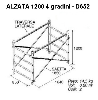 La struttura comprende:1 base completa D6504 alzate 1800 D6511 alzata 1200 D6521 kit di 4 Stabilizzatori grandi con morsetti D6612 protezioni terminali D6581 piano con botola e con fascia fermapiede D6641 piano con botola senza fascia fermapiede D6712 kit di protezione per piano D670I livellatori non sono compresi (vedere articolo D675)GUIDA ALLE STRUTTURE COMPLETE DI PIANI CONFORMI AL DECRETO LEGISLATIVO 81/2008 1 - Il KIT DI PROTEZIONE è obbligatorio sul piano di sosta di lavoro ed anche sui piani di passaggio. 2 - La FASCIA FERMA piedi è obbligatoria solo sul piano di sosta di lavoro. 3 - Per montaggio e smontaggio SONO OBBLIGATORIE MINIMO 2 PERSONE. 4 - OBBLIGO ANCORAGGIO a muro o struttura fissa ogni 4 metri (stabilizzatori non obbligatori).