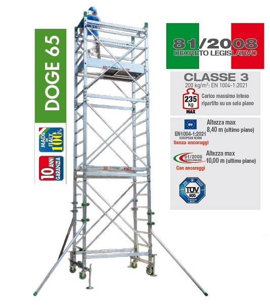 PONTEGGIO IN ALLUMINIO SU RUOTE DOGE 65 - Codice Facal DG6/7CIT. Trabattello professionale di rapido montaggio.Struttura completa di piani a norma Decreto Legislativo 81/2008. Obbligo ancoraggio a muro o struttura fissa ogni 4 metri (stabilizzatori non obbligatori).Il montaggio ed utilizzo deve essere eseguito con cinture di sicurezza complete di dispositivi anti caduta, a cura dell’utilizzatore.Grande solidità e fermezza grazie alle traverse con crocere in alluminio fuso che squadrano e legano la struttura ad ogni alzata. Montanti 25x65 mm. e piani in alluminio con calpestio in legno antiscivolo, idroresistente e melaminico certificati. Anime d'acciaio per innesti verticali.Testata di base con gruppo porta ruota in alluminio fuso e livellatori scorrevoli (livella di controllo).Blocco istantaneo delle saette con esclusive molle inox.