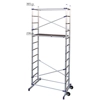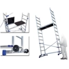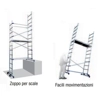 Trabattello d'alluminio a due alzate con innesti d'acciaio rivestiti di speciali resine. Collegamenti orizzontali e diagonali istantanei con espansori nei fori dei gradini. Lunghe leve di facile uso. Piano in alluminio e legno antiscivolo, idroresistente, melaminico con ganci di ancoraggio saldati al pianale. Le barre stabilizzatrici hanno una doppia posizione per permettere anche la lavorazione a filo muro.