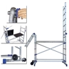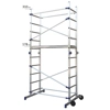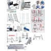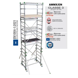Trabattello tutto alluminio ripiegabile trasformabile in scale. Collegamenti orizzontali e diagonali istantanei con espansori nei fori dei gradini. Lunghe leve di facile uso. Piano in alluminio e legno antiscivolo, idroresistente, melaminico con ganci di ancoraggio saldati al pianale. Le barre stabilizzatrici hanno una doppia posizione per permettere anche la lavorazione a filo muro. I fianchi si ripiegano verso l'esterno grazie alla cerniera istantanea automatica in alluminio fuso con anima di acciaio. Questo trabattello ha un sistema di sollevamento rapido delle ruote per l'utilizzo delle scale a cavalletto o semplici di appoggio.