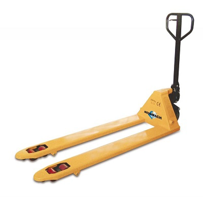 Transpallet manuale portata 2000 Kg. Doppio rullo in poliuretano.Ruote in gomma elastica.Rullino di invito sulle forche.Ingrassatori.