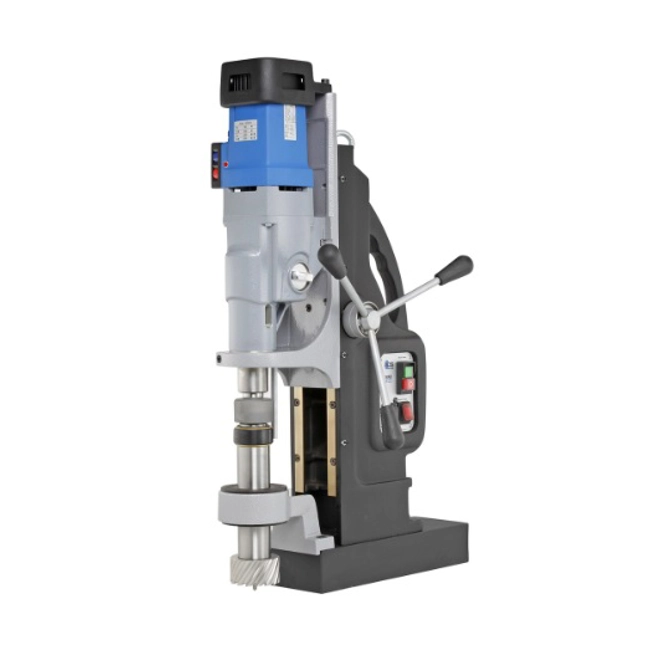 Perforatore a base elettromagnetica serie "Plus" 1300. Cod. 0075791.Il perforatore a base elettromagnetica MAB1300 è tra le più potenti della categoria con motore reversibile con un motore da 2300 W e quattro velocità.Prestazioni superiori e potenza eccezionale è capace di forare fino a ø 130mm (in 30 mm di profondità).Può utilizzare tutta la gamma di frese a corona BDS. La MAB 1300 ha l'attacco diretto Weldon 32 mm. e senza la staffa di supporto, removibile, la corsa aumenta a 310 mm.Naturalmente equipaggiata di tutte le caratteristiche tecniche e di sicurezza in uso sui perforatori a base elettromagnetica. Un ulteriore dispositivo, il Power-Assist, facilita la foratura soprattutto nei grandi diametri, guidando al meglio le operazioni.