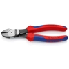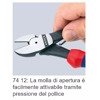 Tronchesi laterali per meccanica tipo "forte" - Articolo Knipex 7412180. DIN ISO 5749. Progettate per la massima sollecitazione continua. L’ottimale combinazione tra il rapporto di leva e la geometria dei taglienti garantiscono elevata capacità di carico e lunga durata senza sforzo (circa il 20% di sforzo in meno rispetto ai comuni tronchesi con tagliente laterale della stessa lunghezza). Caratteristiche Acciaio al cromo vanadio ad alte prestazioni, forgiato, temperato ad olio a gradini.Taglienti di precisione ulteriormente temperati ad induzione (durezza circa 64 HRC) per tutti i tipi di filo metallico incluso filo armonico.Con molla di apertura, attivabile all'occorrenza.Con articolazione forgiata.