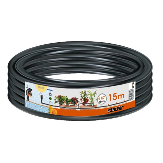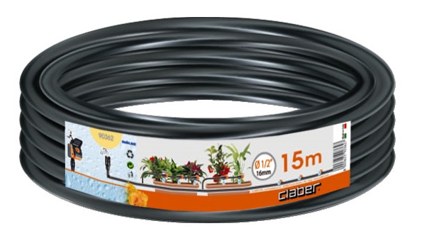 Tubo collettore in polietilene da 1/2" (13-16 mm.) 15 m., per derivazioni dal tubo collettore - art. Claber 90362. Serve a portare l'acqua dal tubo collettore ai gocciolatori o microirrigatori. Realizzato con materiali resistenti e durevoli. Si può tagliare a misura con un semplice paio di forbici, per realizzare qualsiasi circuito di irrigazione a goccia o di microirrigazione, per le piante in vaso, le aiuole e l'orto. Il suo colore nero si mimetizza sul terreno e fra i vasi. Flessibile, antialghe, resiste alle basse temperature e ai raggi del sole.