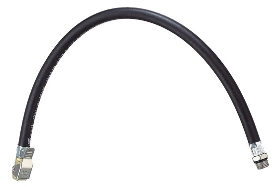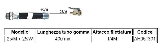Tubo gomma con testina di gonfiaggio ottonata. Leva in acciaio nichelato. Raccordo filettato maschio 1/4".