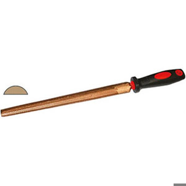 In lega rame-berillio. Manico in materiale bicomponente. Taglio mezzodolce.