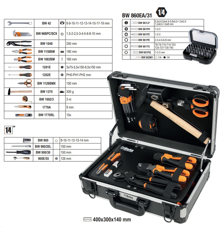 La Beta BW 2052LE-82 è una valigetta porta attrezzi completa e professionale, contenente 82 utensili disposti in vassoi morbidi in EVA (Etilene Vinil Acetato) che garantiscono ordine, protezione e facile accesso a ogni strumento.