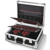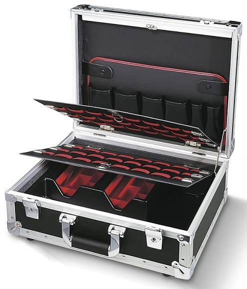 Valigia porta utensili 198/BA TECNO.Valigia dalla linea squadrata con ottime prestazioni e dal peso contenuto.Realizzata in materiale Abs di colore nero, antiurto e indeformabile con superficie antigraffio.Struttura e profili di chiusura estrusi in alluminio anodizzato interamente rivettati.Angoli di protezione spigoli in acciaio cromato.Ottima resistenza agli urti e portata senza limiti di peso.Valigia per assistenza tecnica professionale, attrezzata internamente per alloggiamento utensili.