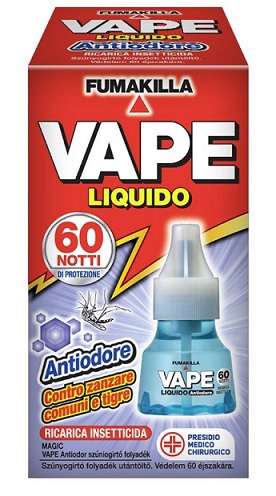 VAPE VP2019430 ricarica insetticida liquida 60 notti.Vape liquido assicura una protezione costante da zanzare e zanzare tigre per ben 60 notti senza che si renda necessaria la sostituzione della ricarica.Emana una delicata profumazione antiodore per gli odori sgradevoli della casa.Questa confezione contiene un flacone di ricambio per elettroemanatore elettrico Vape e risolve con praticità il problema delle zanzare.Presidio medico chirurgico.