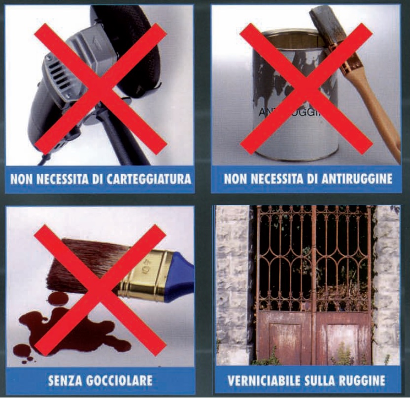 Antiruggine + vernice di finitura. Colore peltro metallizzato.Pronto all'uso. Prodotto verniciante che unisce le proprietà caratteristiche di un ottimo smalto (copertura, lucentezza, gamma colori) a quelle tipiche di un fondo antiruggine (protezione dalla corrosione). Strutturato in forma di gel morbido per evitare le colature ed assicurare al tempo stesso un'ottima pennellabilità. Si può applicare direttamente sulla ruggine senza eliminarla completamente mediante carteggiatura. Non contiene componenti nocivi come piombo e cromo. Disponibile in un'ampia gamma di tinte. Adatto per esterni ed interni. Disponibile nelle tinte brillanti, satinate, metallizzate ed antichizzanti. Campi d'impiegoProdotto destinato alla protezione e finitura di manufatti in ferro, anche arrugginiti. Non necessita l'applicazione di un fondo anticorrosivo. Idoneo sia per interno che per esterno. Può essere applicato con buoni risultati anche su alluminio, legno e cemento. Preparazione supportoSuperfici nuove: sgrassare con acquaragia e applicare la vernice.Superfici da riverniciare:se è presente la ruggine spazzolare,eliminare la vernice male ancorata, procedere come per le superfici nuove