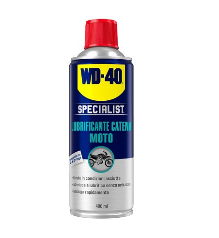 WD40 Lubrificante catena moto Specialist 400ml - Codice WD40.LUBRIFICANTECAT.WD40 lubrificante catena moto fornisce una lubrificazione e una protezione di lunga durata alla catena.E' particolarmente adatto agli ambienti asciutti grazie alla sua eccezionale azione di lunga durata.Si asciuga rapidamente e ha eccellenti proprietà anti-spruzzo.Utilizzabile su: catena moto, trasmissioni, compatibile con O, X e Z ring.