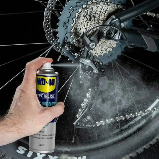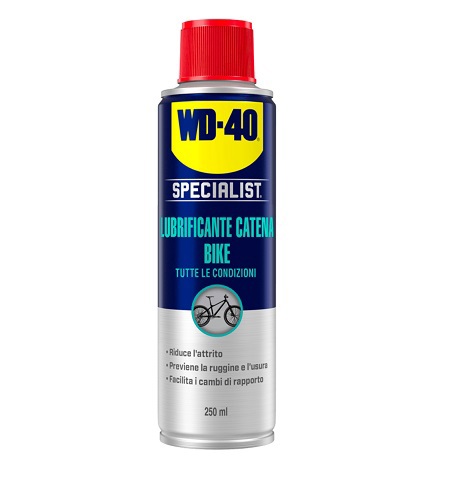 WD40 Lubrificante Catena Bike Specialist - Cod.WD40.LUBRIFICATBIKE Mantieni la trasmissione della tua bici sempre efficiente con il lubrificante catena bike per tutte le condizioni, studiato per garantire prestazioni elevate in qualsiasi situazione atmosferica. La sua formula avanzata assicura lubrificazione duratura, riduce l’attrito tra i componenti e contribuisce a limitare l’usura della catena e delle parti mobili. Il prodotto penetra in profondità nei meccanismi, formando una pellicola protettiva che aiuta a prevenire la corrosione e impedisce allo sporco di aderire facilmente. In questo modo la trasmissione rimane più pulita e la pedalata risulta più fluida e silenziosa. Grazie alla cannuccia integrata nell’erogatore, l’applicazione è semplice e precisa anche nei punti più difficili da raggiungere, permettendo di distribuire il lubrificante uniformemente lungo tutta la catena CaratteristicheIdeale per tutte le condizioni atmosfericheRiduce l’attrito e migliora la scorrevolezza della trasmissioneProtegge dalla corrosioneFormula progettata per limitare l’accumulo di sporcoApplicazione precisa grazie alla cannuccia integrataLubrificazione duratura ed efficace